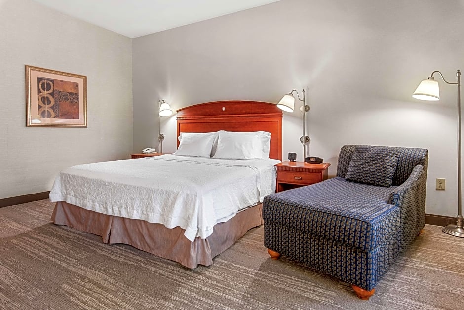 This spacious room features a king sized bed, comfortable easy chair with ottoman, and large work surface.